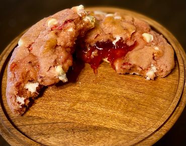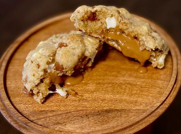 Brown butter vanilla cookie base with semisweet chocolate chips folded in, stuffed with caramel and topped with sea salt.