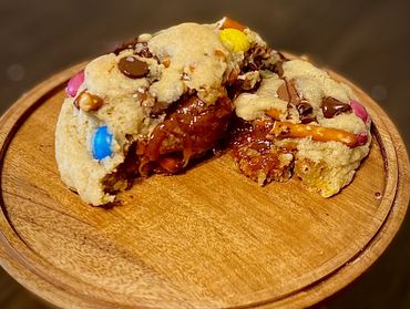 A peanut butter cookie dough with peanut butter M & M’s and peanut butter chips folded in with a peanut butter filled center.